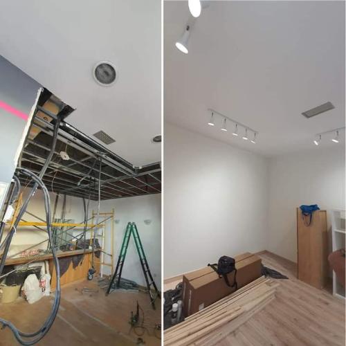 Albañiles para asegurar falso techo a ambos lados de una pared en local comercial