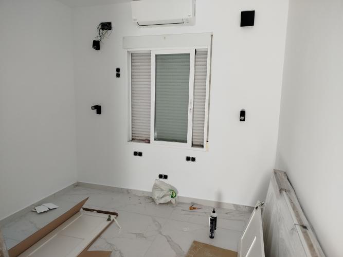 Tirar tabique y unir 2 habitaciones, cambio de sitio de enchufes, mover puerta, pintura quitando gota. Superficie total 8m2. Instalar aire acondicionado con desagüe a baño. Poner puertas correderas de armario, 2'20m, de suelo a techo.