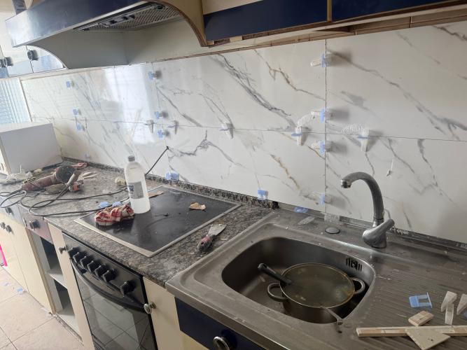 Están asi desde navidades después de un viaje. Al volver estaban levantados y a vueltas con el seguro que como siempre, es cosa lenta para al final decirte que no entra en lo contratado. Son unos pocos azules en la pared, levantados y aun ahi, no están rotos. Solo seria quitarlos con cuidado para volver a colocarlos.