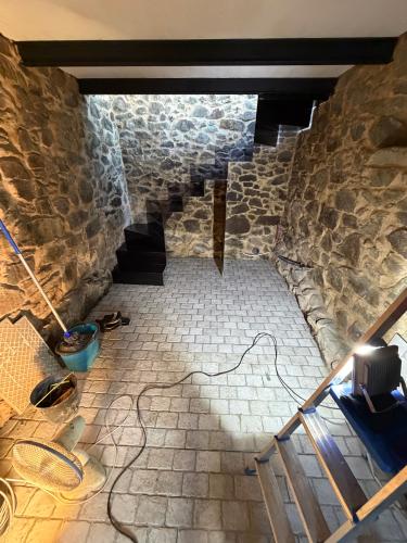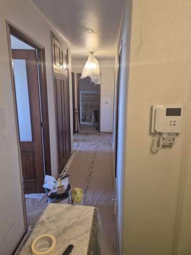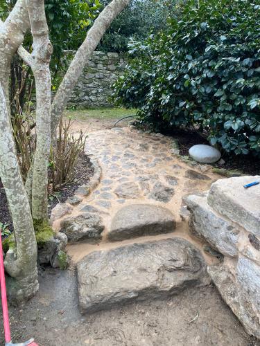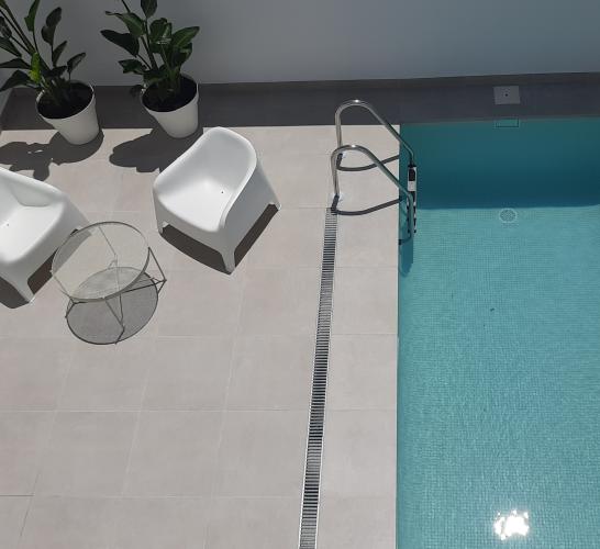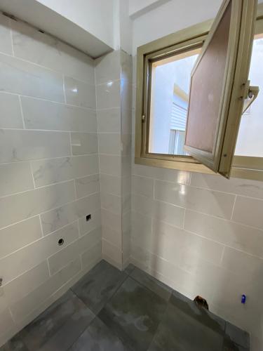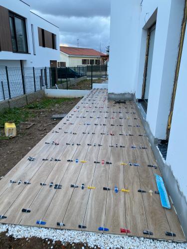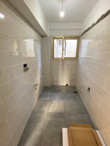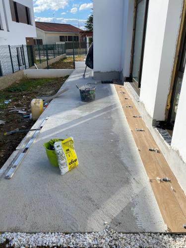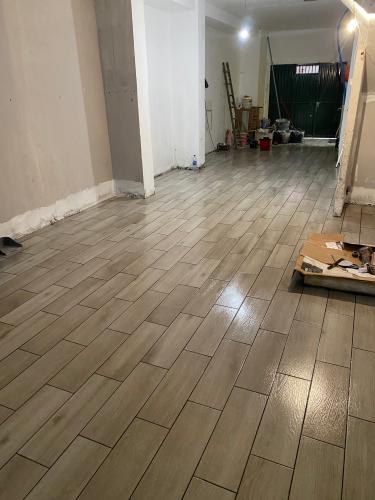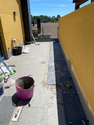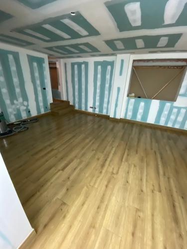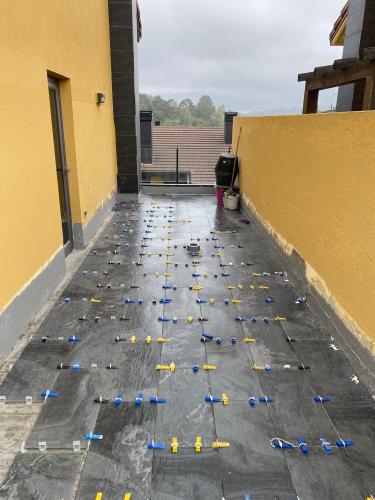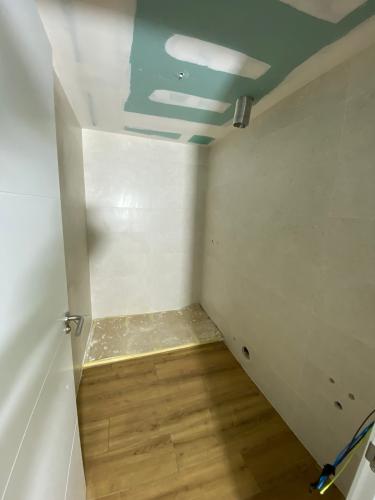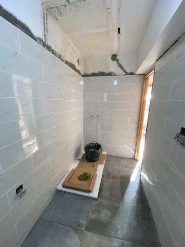 Suelo levantado tras cambio de fontanería, se trata de allanar el suelo, y echar azulejo tanto en el suelo como en las paredes. Poner pavés en un lado de la ducha, y colocación de puerta de ducha. Enyesar un trozo de techo de una habitación, ya que se ha tirado un armario empotrado.