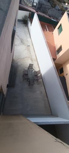 Se trabaja desde el salón de la vivienda para alisar un pequeño parterre sobre 1,5 metros por 50 centímetros, justo el espacio de un unidad exterior de un aire acondicionado. No es u trabajo en altura se realiza desde el mismo salón