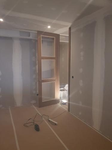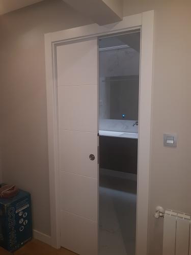 Queremos colocar una puerta desde el rodapie hasta el techo cubriendo los armarios de los magnetotérmicos. Con bisagra invisible y un cierre de imán o similar. Posteriormente vamos a empapelar la puerta para que quede disimulada en la pared.