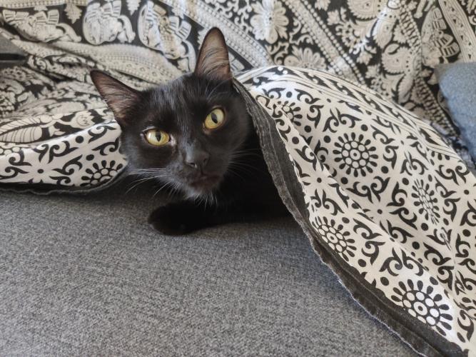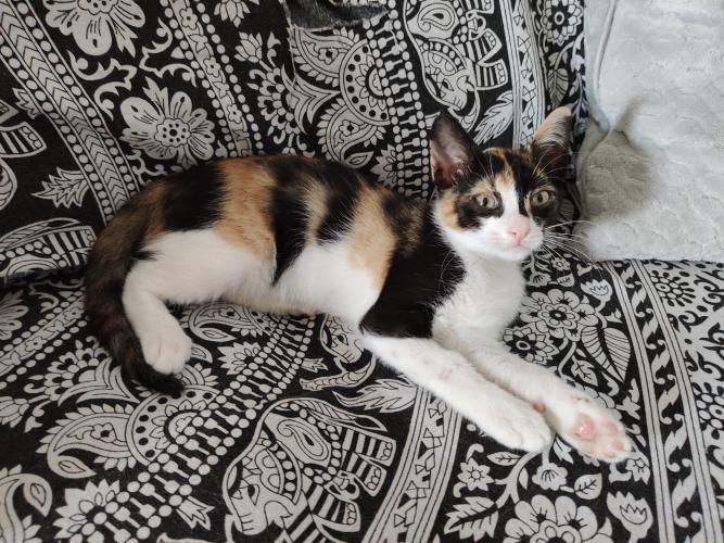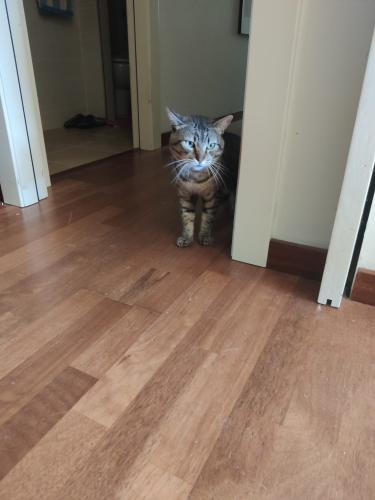 Es una gata de más o menos tres años rescatada de la calle, lleva 8 meses viviendo en mi casa. No tiene ningún interés para salir de casa, ni si quiera al jardín, si no está acompañada. Es asustadiza al principio, hasta que coja confianza con las personas, después te sigue a todas partes. Solo come un pienso especial para alergias y probioticos todos los dias
