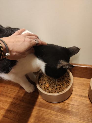 Come pienso brekkies y comida blanda de wiskas 1+, los premios y la comida la traemos nosotros. Es muy cariñoso, le encanta subir encima de las personas y del sofá, solo araña el rascador, y es muy cotilla pero a la vez miedoso, porque sale al balcón pero le da miedo que le cojan estando fuera.