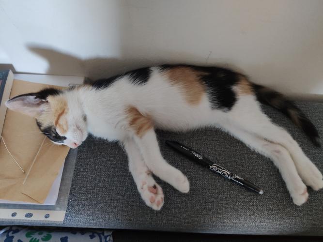 Se llama xira, es muy dócil. Tiene el sacro roto y es incontinente, lleva pañal en casa, fuera no (jardín, patio, terraza, calle ...). Se deja, dócilmente, asear y cambiar el pañal. Es una gata muy normal, pero con pañal. Periódicamente asearla y ayudarla a defecar con enema. Con xira aportamos su comida y los productos de aseo para 15 días.