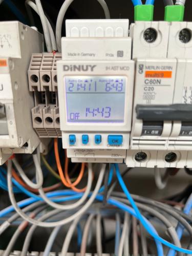 El fusible del programador del cuadro electrico de la depuradora de la piscina me ha dejado de funcionar. Es bastante antiguo (de los de rueda), y ha dejado de girar. Ya que tengo que cambiarlo, me gustaría hacerlo por otro que tenga control remoto mediante wifi, de tal forma que pueda programar el encendido de la depuradora desde una aplicación en el móvil. Adjunto fotos del cuadro electrico...