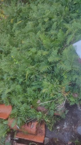 Es un pequeño terreno con césped que se ha llenado de malas hierbas y la zona que tenía malla y piedras se ha llenado de vegetación y se debe recuperar. No es un terreno grande.