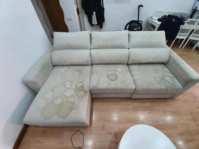 En mi casa han habido obras y como tiene 5 años necesita una limpieza, tiene una mancha en asiento en el centro de unos 20 25 cm redonda. El sofá es algún tipo de tela de color gris oscuro.