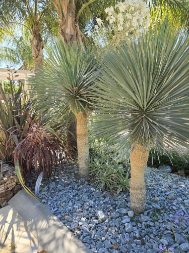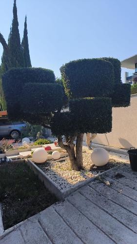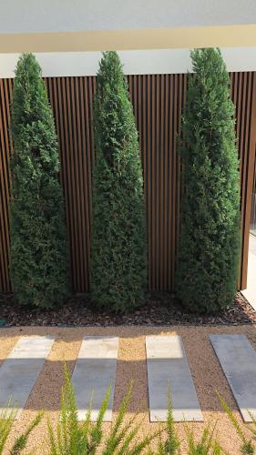 Se trata de sustituir 4 árboles de 5 metros de altura (tipo fresno / abeto) quemados por un producto hebicida. Debemos retirarlos y sustituir por otros del mismo estio o bien palmeras. Objetivo sombra y altura superior a 3 metros Gracias