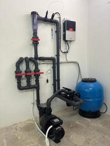 Necesito cambiar la arena del filtro de la piscina, y revisar una llave de paso del agua que va dura y no cierra bien. Piscina antigua que necesita una revisión