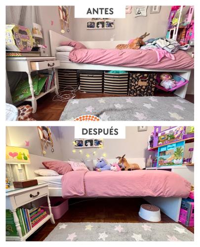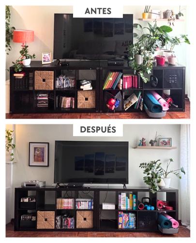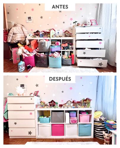 Tenemos una casa de 55 metros y somos 4: dos adultos y dos pequeñas (3 y 2 años) + un gato. La casa suele estar desordenada, no solo por las pequeñas, sino que al haber poco espacio y no tenerlo bien organizado se nos hace imposible mantenerlo