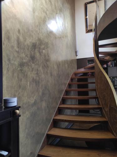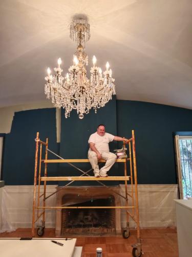 Tiene algunas paredes de hasta 4 m de altura. Hará fata 1 cuerpo de andamio y/o escalera alta. Son unos 330 m de plástico de alta calidad y un remate de unos 10 m2 de gotelé en 3 paredes. Poco mobiliario que descolgar y volver a colgar pero que hay que proteger muy bien porque está lacado.