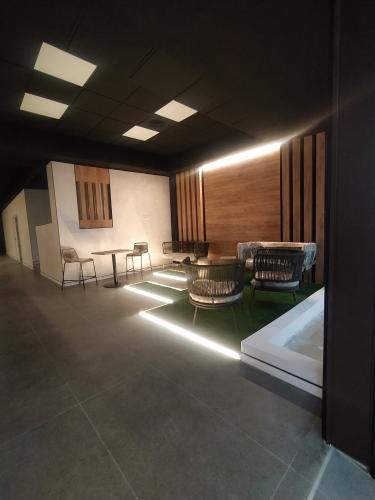 Una pared y parte del techo tiene una mancha de humedad ya seca. Esta pintado en verde claro y lila, se pintaría todo en blanco