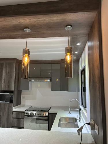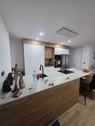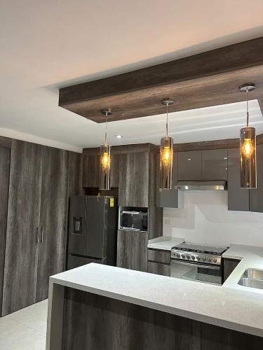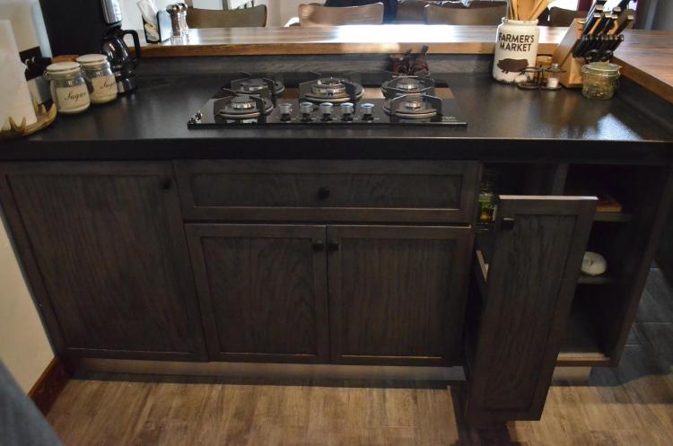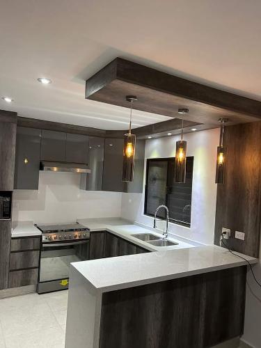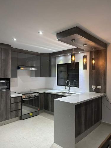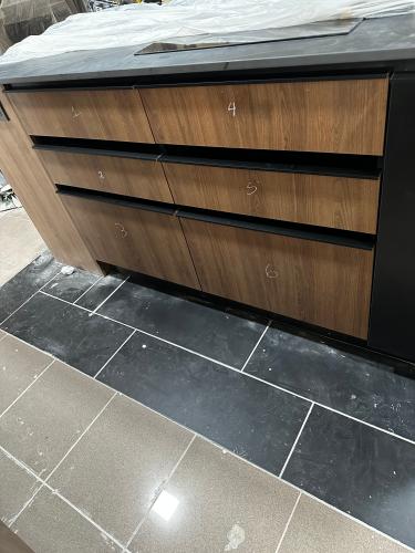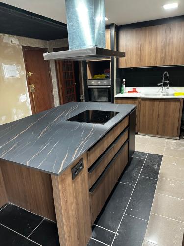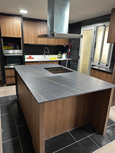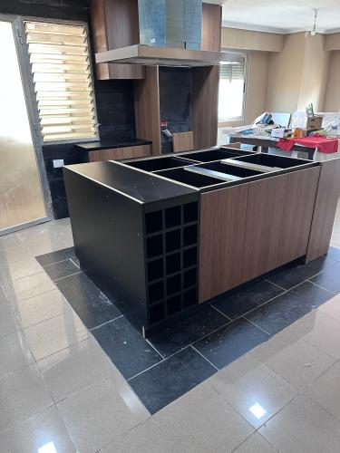 Es para quitar un módulo de la cocina para poner un lavavajillas. Hay que hacer un agujero en el módulo de al lado para la toma de agua. Creo que en la parte de arriba tiene una madera que está pegado a la encimera de la cocina. También habría que quitar un zócalo de piedra que rodea la cocina por el suelo.