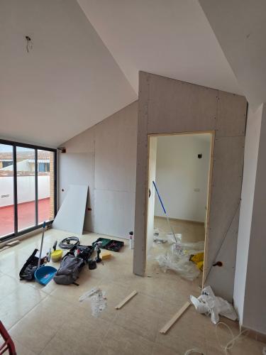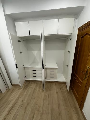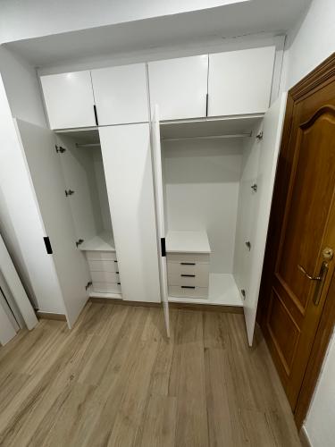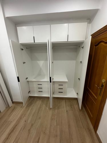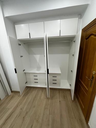 Actuaciones a presupuestar: 5 armarios empotrados, para poner cajoneras i/o estantes. En uno de ellos(de tres puertas) cambiar las puertas abatibles por correderas En la cocina poner puerta corredera en alacena y añadir un módulo para ampliarla zona de trabajo Dar alguna solución de almacenaje al hueco de la escalera