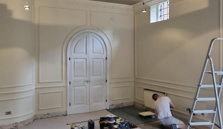 Es una habitación que se le ha quitado el papel pintado y hay que pintarla de color.