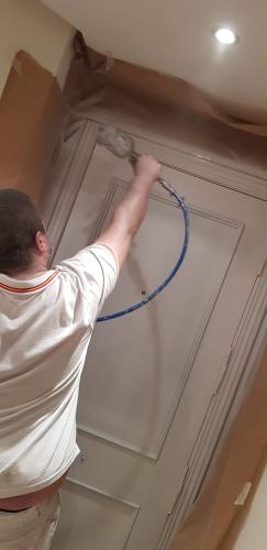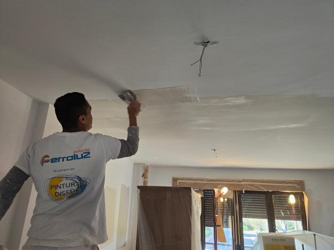 Necesito pintar dos estancias de un piso: 1. Salón de unos 25 m2. En blanco, con paredes, techos y los dos bombos de las persianas, 2. Dormitorio de unos 12 m2. En gris perla, con paredes, techos y los dos bombos de las persianas. Superficies con gotelé. Actualmente ambas estancias están en blanco. En un par de puntos hay rotura del pladur que necesita ser reparado. Puedo pasar...