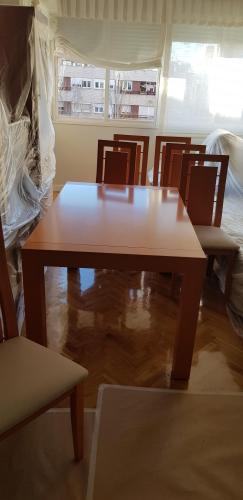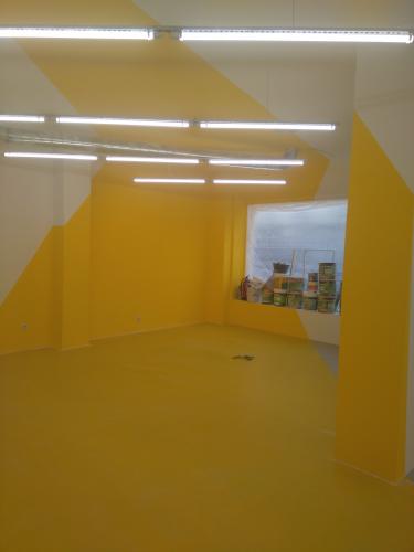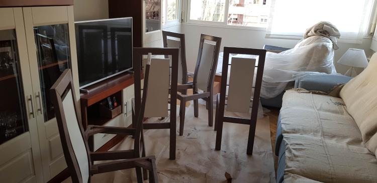 Se trata del salón de la vivienda. Tiene unos 24 m2, pero una pared está ocupada por un gran ventanal y otra tiene una puerta grande. Esos espacios no hay que trabajarlos. Los agujeros que tiene la pared ahora no es necesario quitarlos ni taparlos. Se podría hacer a partir del 1 de octubre.