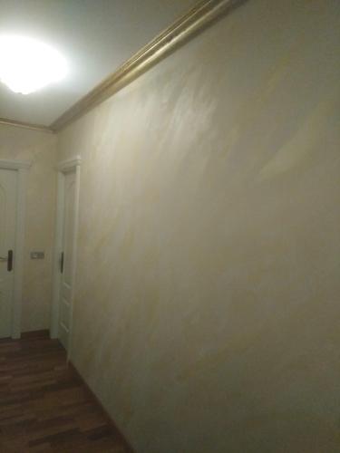 Son exactamente 92 metros cuadrados de pared y techo con gotelé los que hay que alisar. Corresponden con tres paredes y techo de una habitación, el pasillo (paredes y techo) y dos paredes del salón y parte del techo. El gotelé es temple en salón y pasillo. Sin embargo en la habitación tiene una capa de plástica. Todo blanco y la pintura nueva también sería en blanco y plástica.