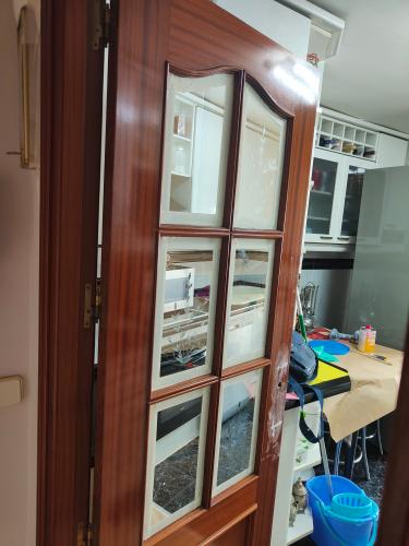 1º habitación, paredes lisas mas armarios, mas puerta. 2º pequeña terraza. 3º habitación lisa mas ventana madera y puerta. 4º techo cuarto baño, en mal estado. Techo cocina, buen estado. 4º puerta y ventana cuarto baño. De momento, si nos gusta iríamos con toda la casa.