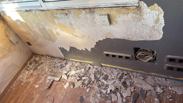 Hicimos un tratamiento anti-Humedades en la pared. Pero el producto del tratamiento no ha podido secarse debido a la humedad que retiene el yeso de la pared. La compañía anti-Humedades nos ha indicado que tenemos que quitar medio metro de yeso para que pueda secar el producto y, pasado aproximadamente 3 meses, cuando nos den el ok, podremos volver a poner yeso y pintar las paredes.
